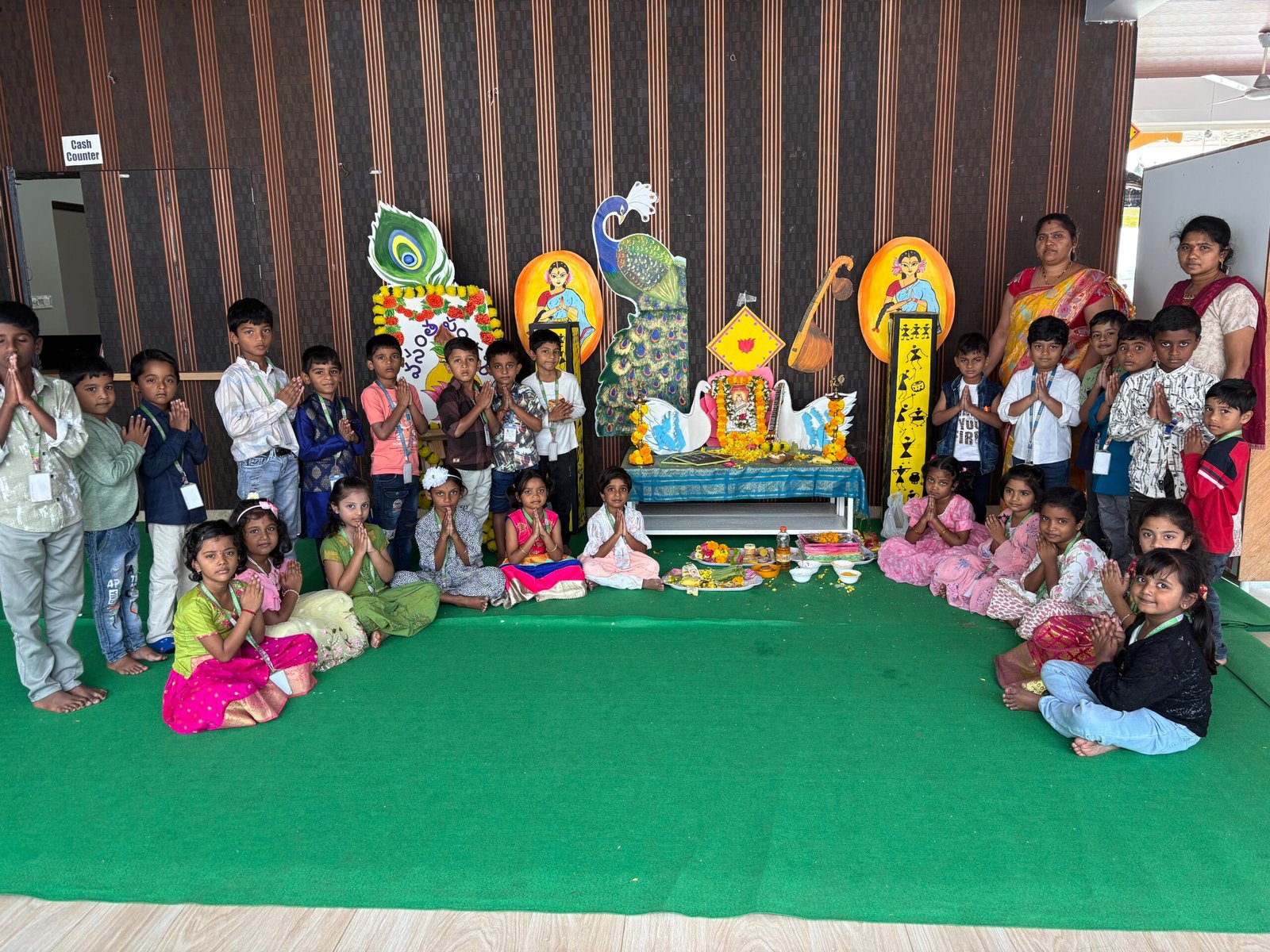 “Tiny Hearts, Big Devotion” Our kindergarten celebrated Krishna Janmashtami with devotion and joy. The little ones looked adorable as Krishna and Gopikas, enjoyed pot-breaking, danced happily, and enacted Krishna’s childhood moments and his friendship with Sudhama. Teachers also narrated the story of Krishna’s birth, making the celebration meaningful and memorable.